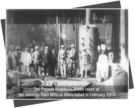 The Pioneer Magnesia Works was established in 1915 at Kharagodha in the Little Rann (Desert) of Kutch. Prior to that the two founders, Behramji Lalkaka, Esq., JP, and his cousin the Hon'ble Sardar Sir Rustom Vakil, had started making magnesium chloride by carting the bitterns from that region all the way to Ahmedabad by train in 1913, for further process. By 1915 these two gentlemen ventured forth into the wild and arid region of Kharagodha, where the raw material "bitterns" was available. It was considered the best magnesium chloride in the world. It was exported all over the British Empire.